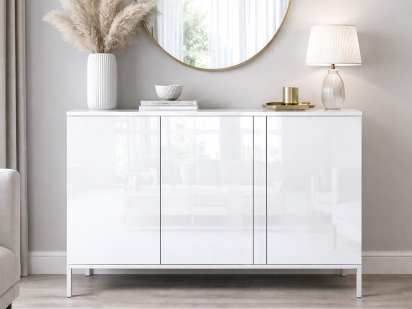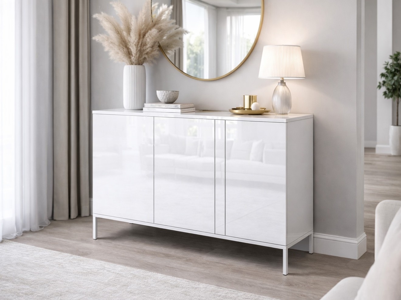 Ta nowoczesna komoda biała została zaprojektowana z myślą o przechowywaniu. Trzy pojemne szafki pomieszczą tekstylia, dokumenty, zastawę lub dodatki, a regulowane półki (3 poziomy wysokości) pozwalają dopasować wnętrze do Twoich potrzeb i utrzymać porządek w każdym pomieszczeniu.