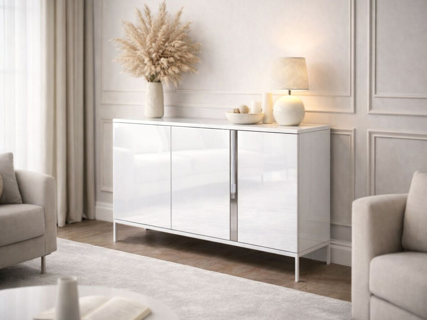 Komoda biała w wysokim połysku z lustrzaną wstawką to nowoczesny i elegancki mebel, który doskonale sprawdzi się w salonie, jadalni lub sypialni. Połączenie połyskującej bieli z dekoracyjną wstawką z grafitowego lustra nadaje bryle luksusowego charakteru i optycznie rozjaśnia wnętrze.