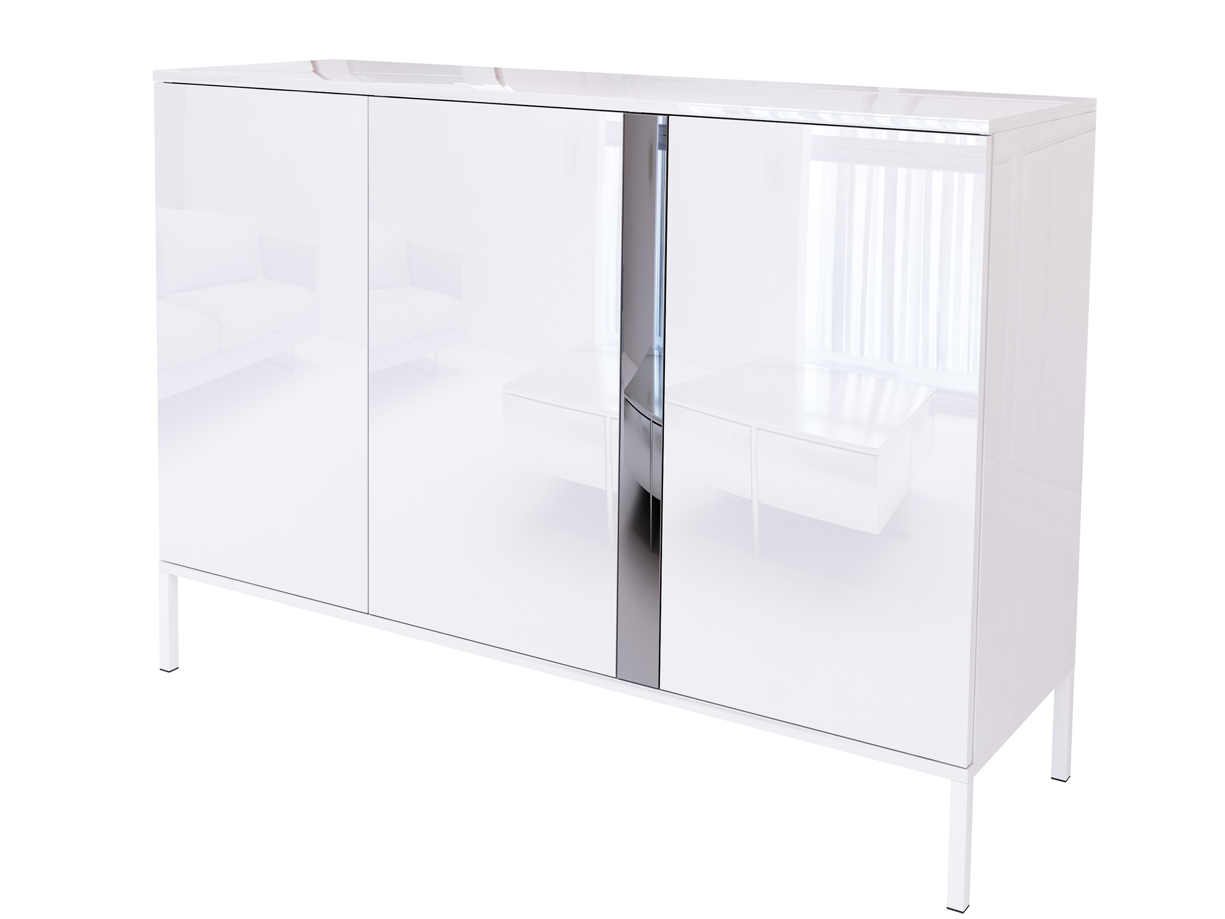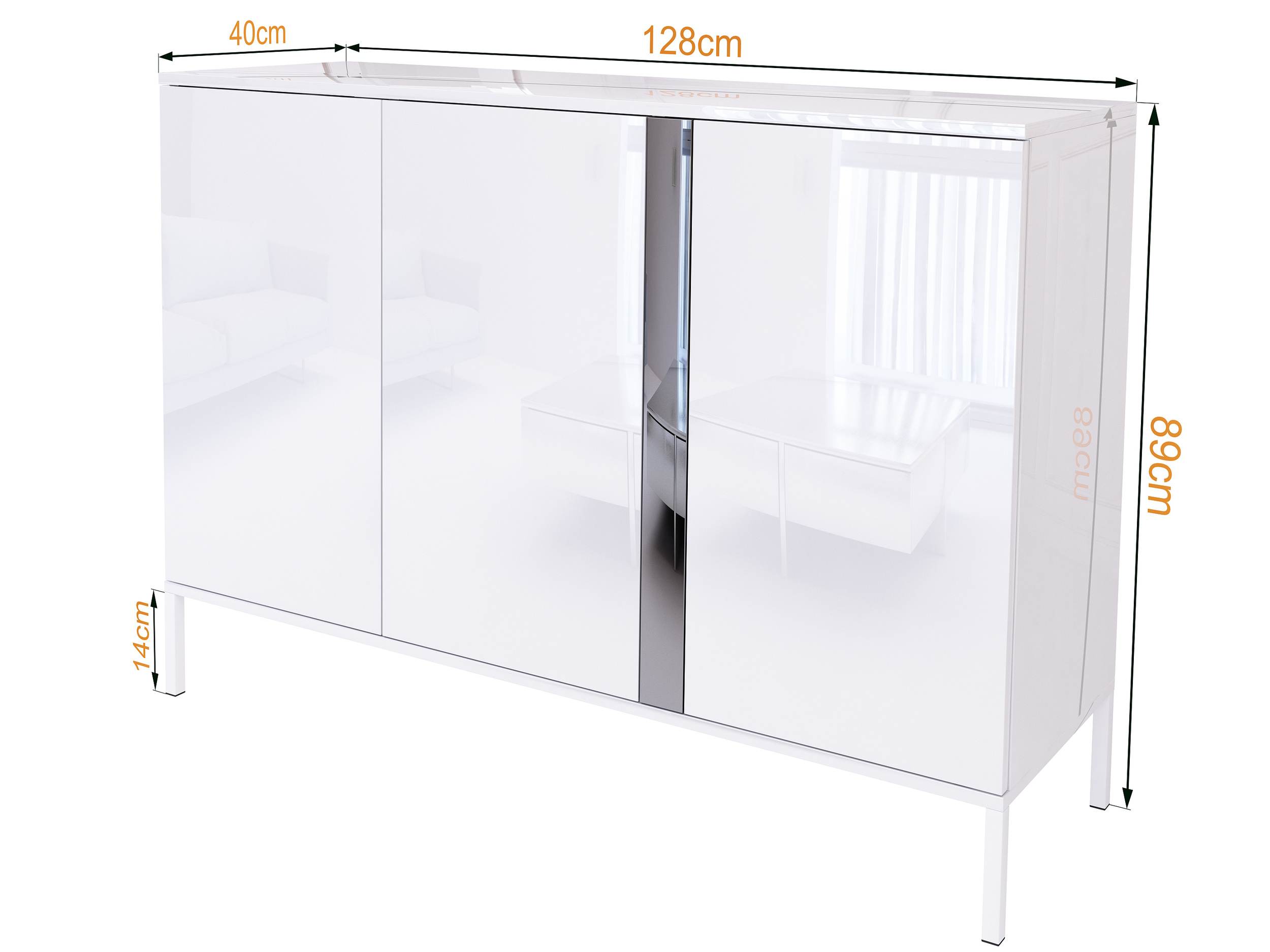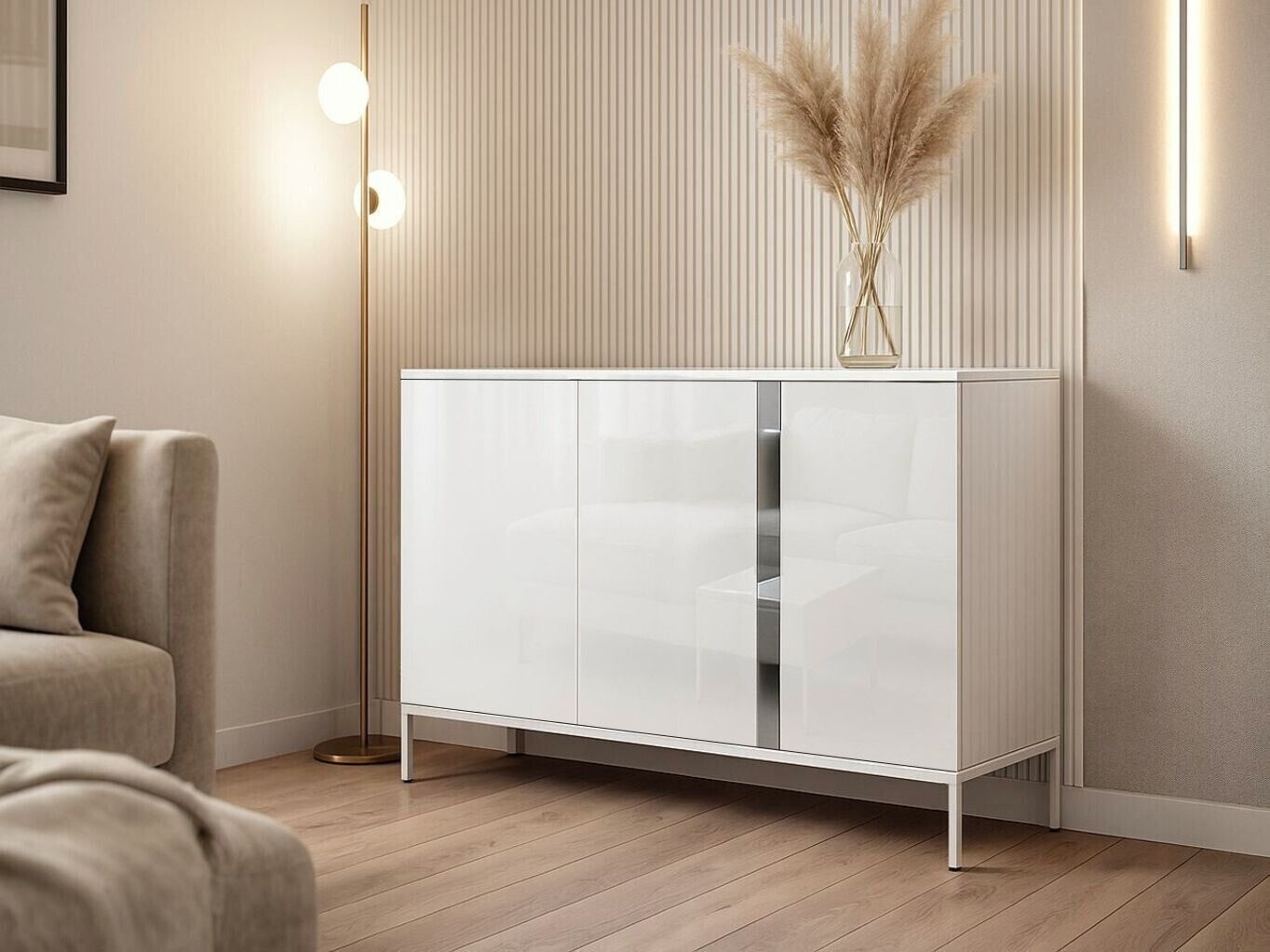 Komoda biała w połysku z lustrzaną wstawką, stojąca na nóżkach idealnie pasuje do wnętrz nowoczesnych, minimalistycznych oraz glamour. Może pełnić funkcję komody do salonu, eleganckiego mebla do jadalni lub praktycznej komody do sypialni. Uniwersalna kolorystyka sprawia, że mebel łatwo dopasować do różnych aranżacji.