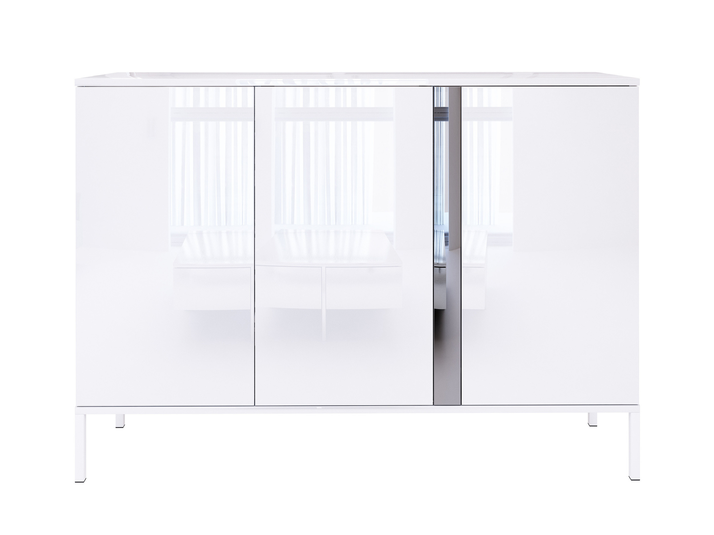 Nowoczesna forma bez uchwytów podkreśla minimalistyczny styl komody. Zastosowany system push to open umożliwia wygodne otwieranie frontu jednym dotknięciem, zapewniając komfort codziennego użytkowania i estetyczny wygląd mebla. Wysokie matowe, metalowe nóżki dodają konstrukcji lekkości, ułatwiają sprzątanie i umożliwiają swobodny dostęp robota sprzątającego pod komodą.