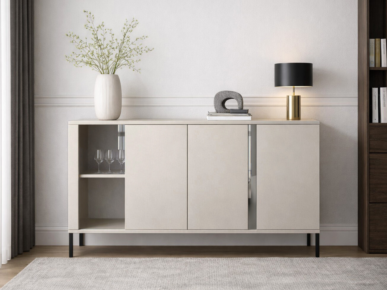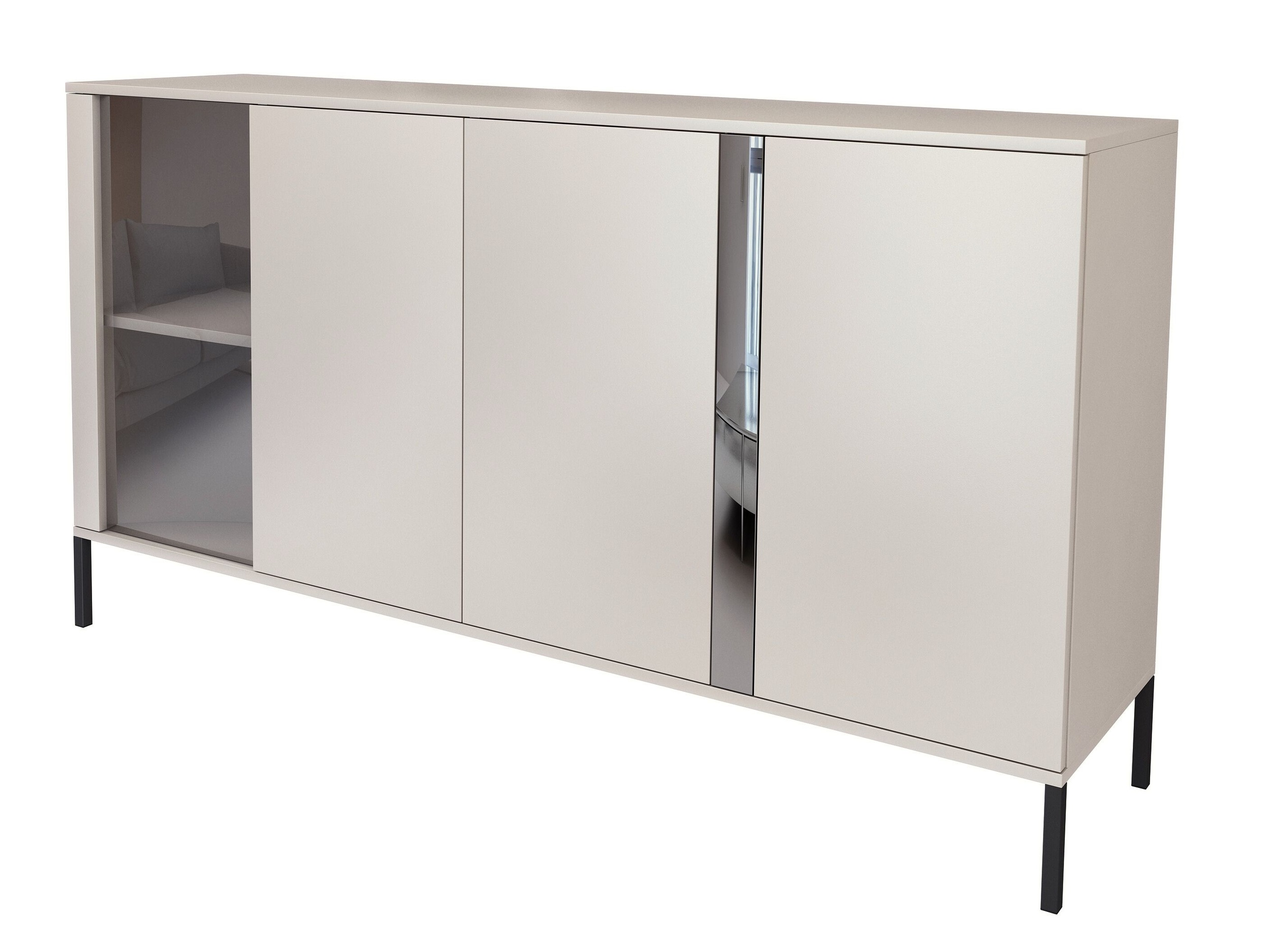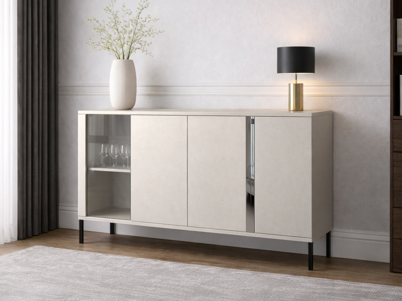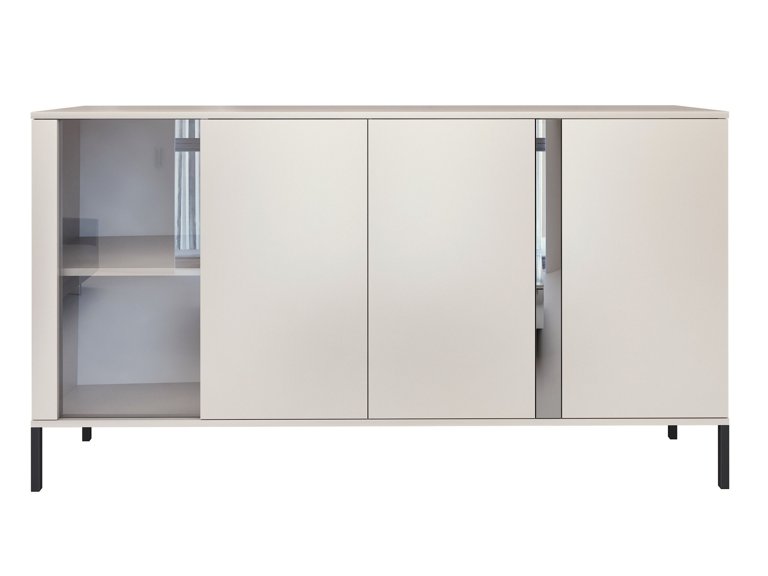 Komoda kaszmir matowy z przeszklonym frontem i czarnymi metalowymi nóżkami - nowoczesna elegancja z nutą lekkości