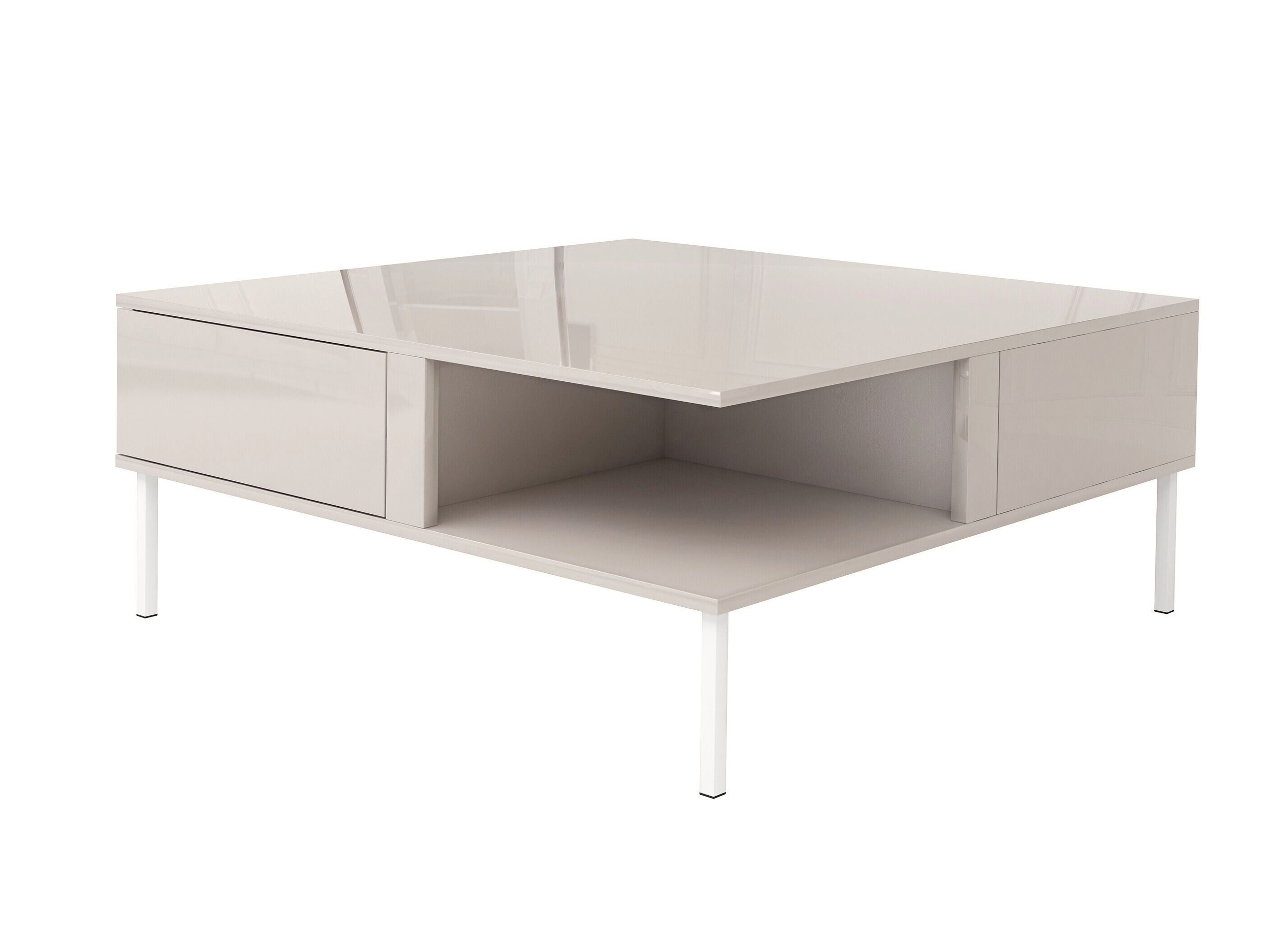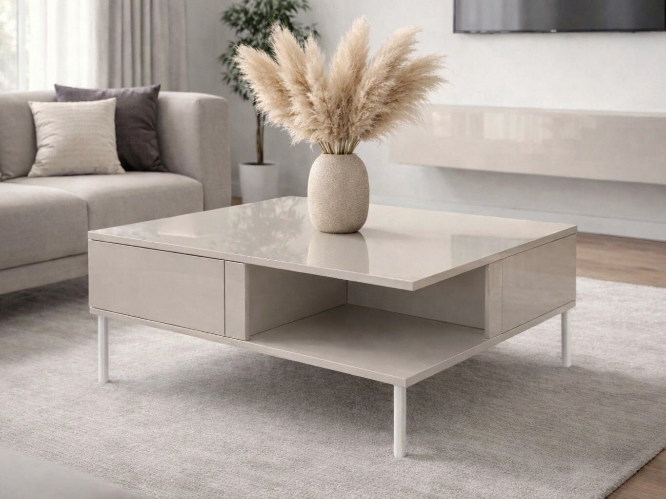 Stylowy i funkcjonalny stolik kawowy do salonu w kolorze kaszmir wysoki połysk to idealne połączenie nowoczesnego designu i wygody użytkowania. Jasna, połyskująca powierzchnia pięknie odbija światło, nadając wnętrzu lekkości i elegancji. Dzięki przemyślanej konstrukcji stolik nie tylko doskonale się prezentuje, ale również jest łatwy w utrzymaniu czystości.