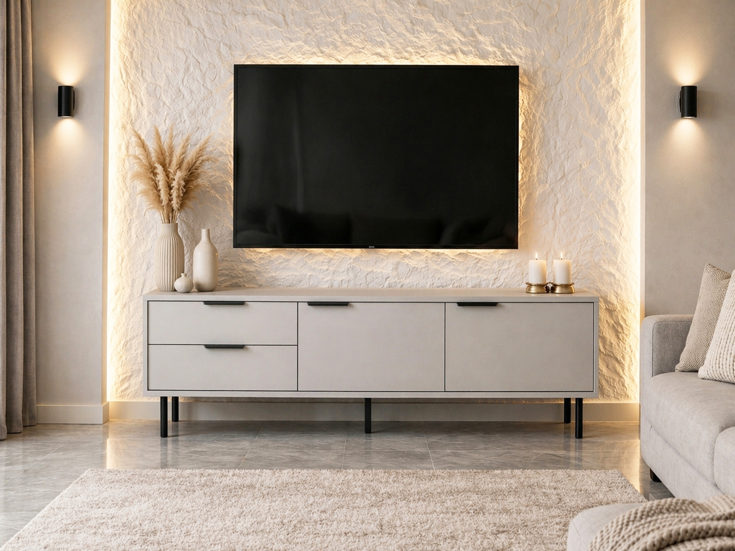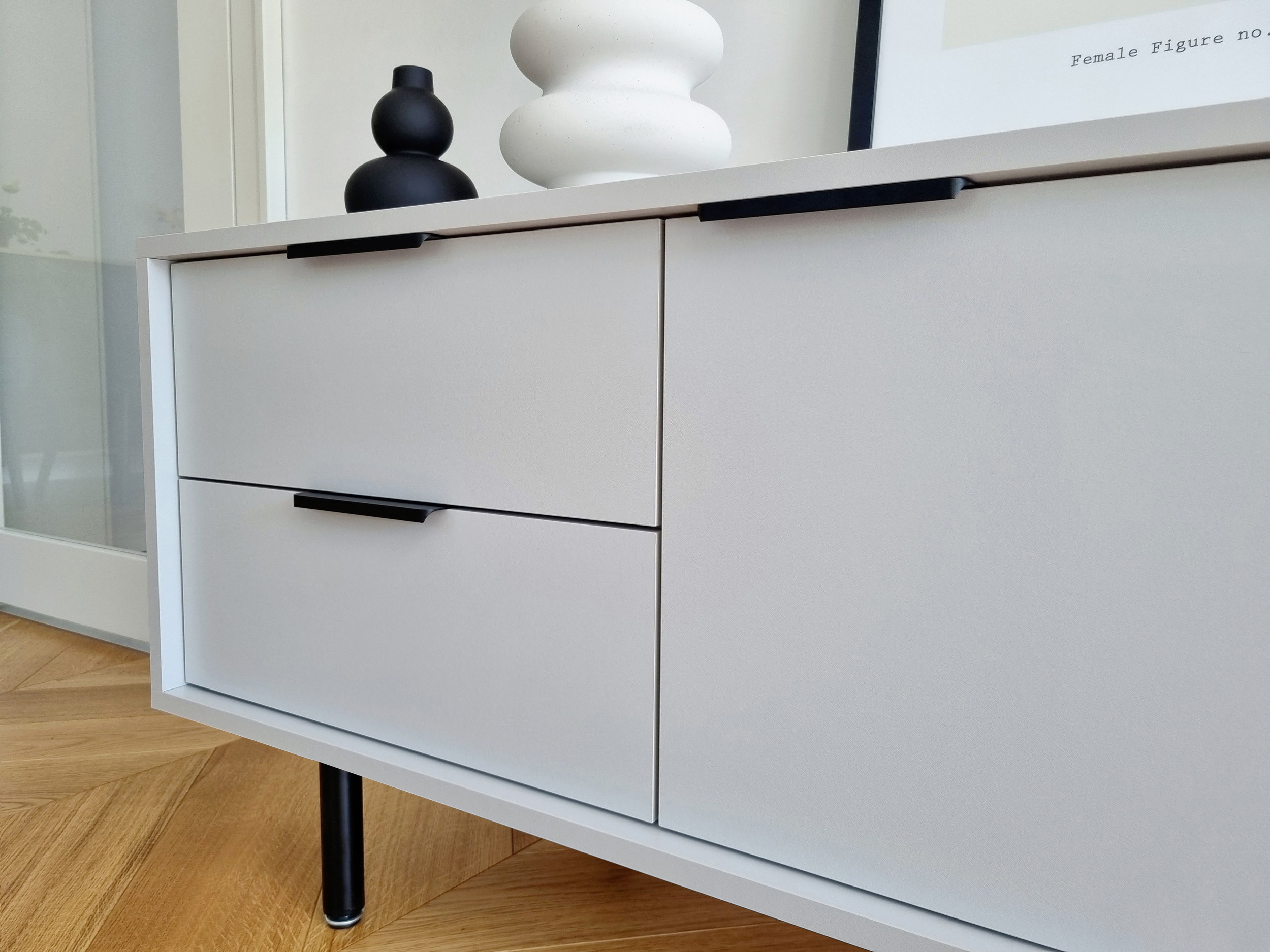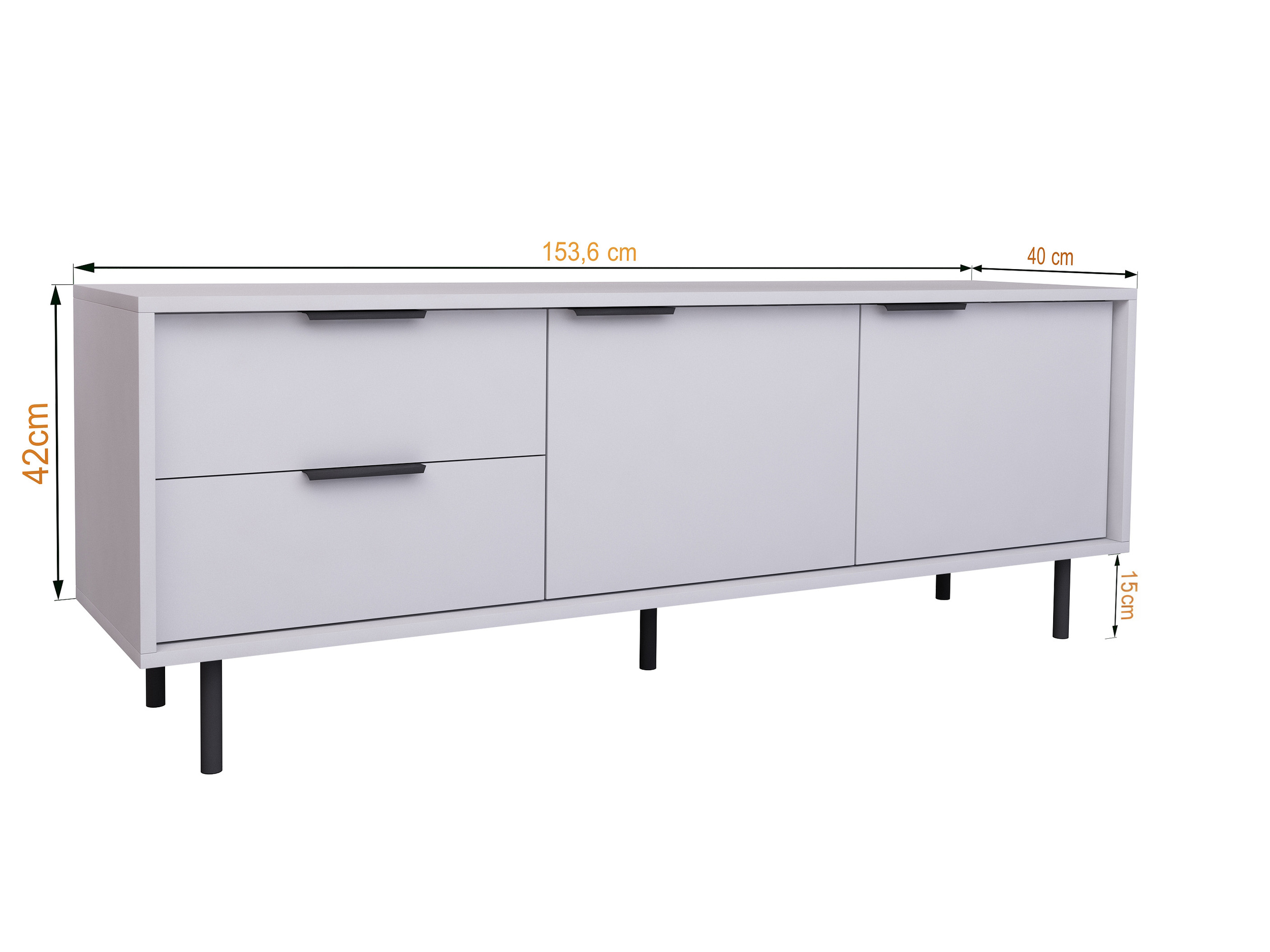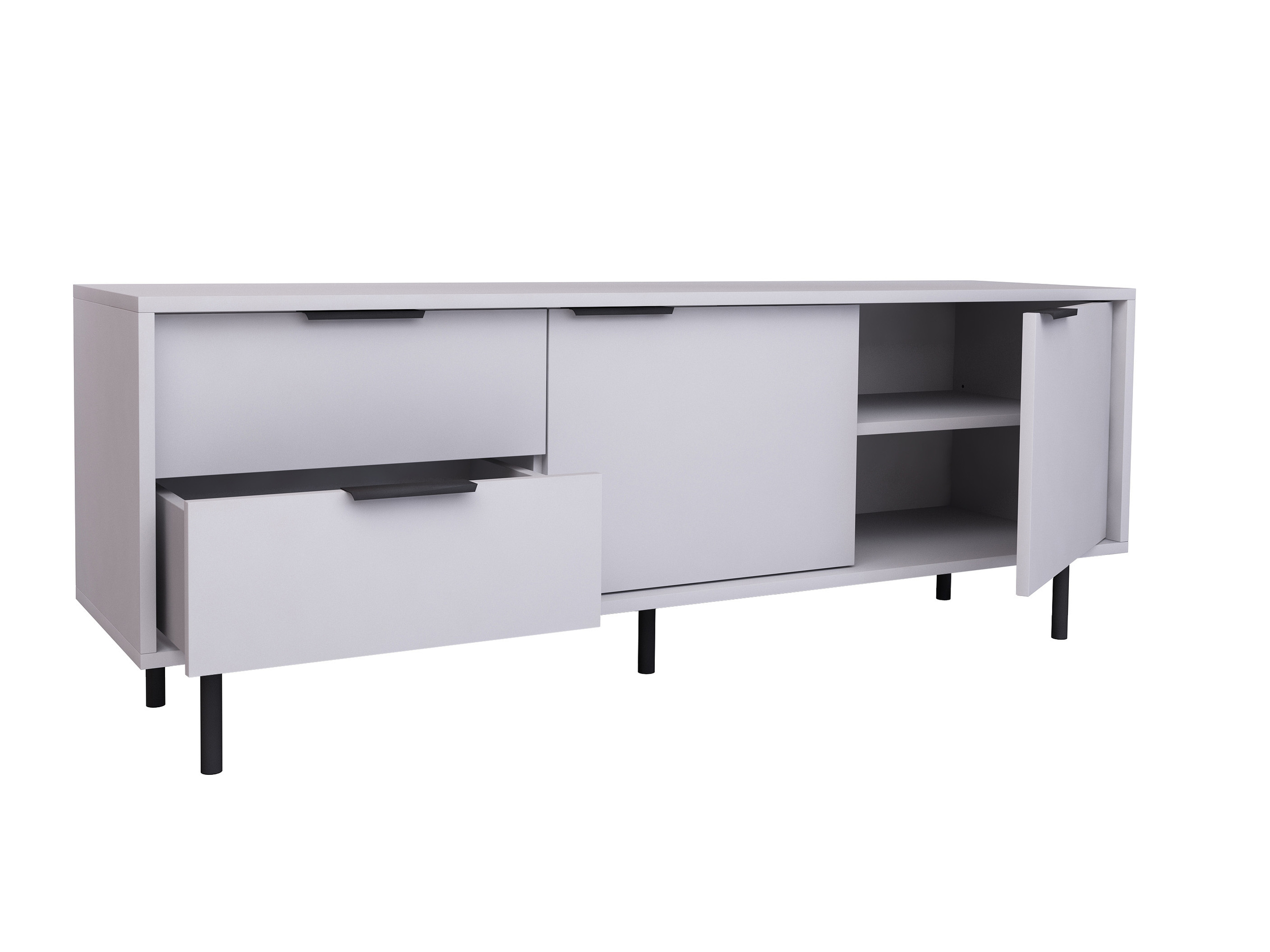 Szafka rtv Cala 1 w jasnym szarym kolorze Szafka pod telewizor Cala 1 w kolorze jasny szary to połączenie pięknego stylu, funkcjonalności i solidnej konstrukcji. Meble w kolorze jasny szary są nowoczesne i estetyczne oraz łatwe w utrzymaniu czystości. Kolor i styl szafki rtv pasuje do różnorodnych aranżacji wnętrz np. salonu w stylu minimalistycznym lub nowoczesnym. Szuflady z cichym domykiem Ta praktyczna szafka tv została zaprojektowana z myślą o pięknym designie i wygodnym przechowywaniu rzeczy, które chcesz mieć pod ręką, ale poza zasięgiem wzroku. Wyposażona jest w dwie, pojemne komory zamykane. W każdej z nich znajduje się wyjmowana półka z trzystopniową regulacją wysokości. Posiada również dwie szuflady, umożliwiające bezproblemowe uporządkowanie pilotów, przewodów czy innych drobnych przedmiotów. Co ważne, szuflady zostały wyposażone w system cichego domykania, który gwarantuje płynne i ciche zamykanie oraz otwieranie. Meble do salonu stojące na czarnych nóżkach Matowa szafka rtv stojąca na metalowych, czarnych nóżkach, które nadają jej stabilność i wyjątkowy charakter. Nóżki posiadają regulację wysokości w razie gdyby podłoga okazała się nierówna. Wysokość nóżek pozwala na swobodny dostęp robota sprzątającego.