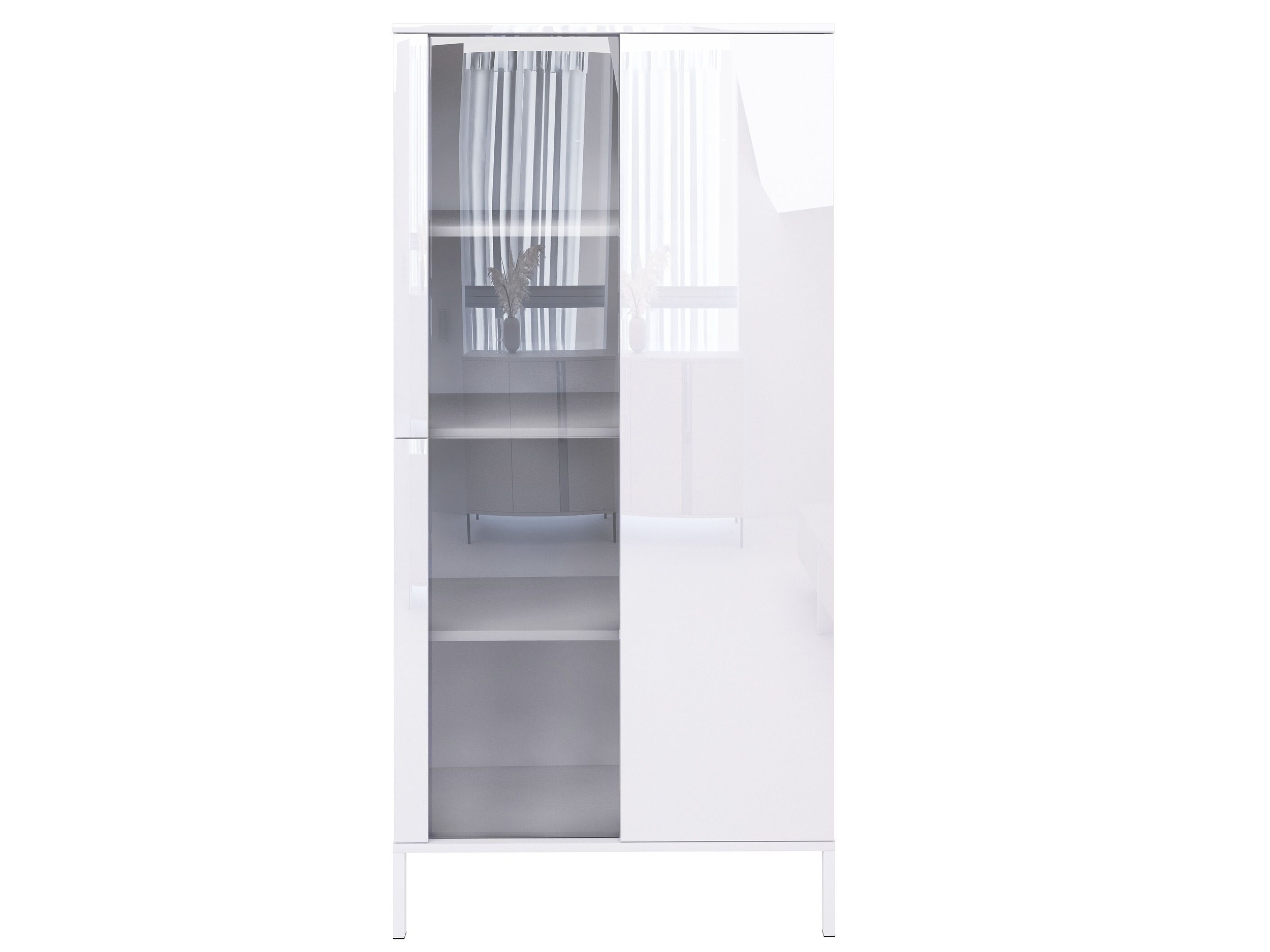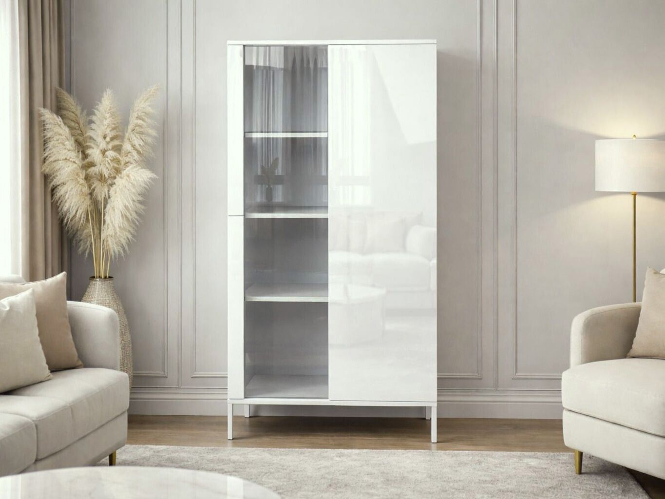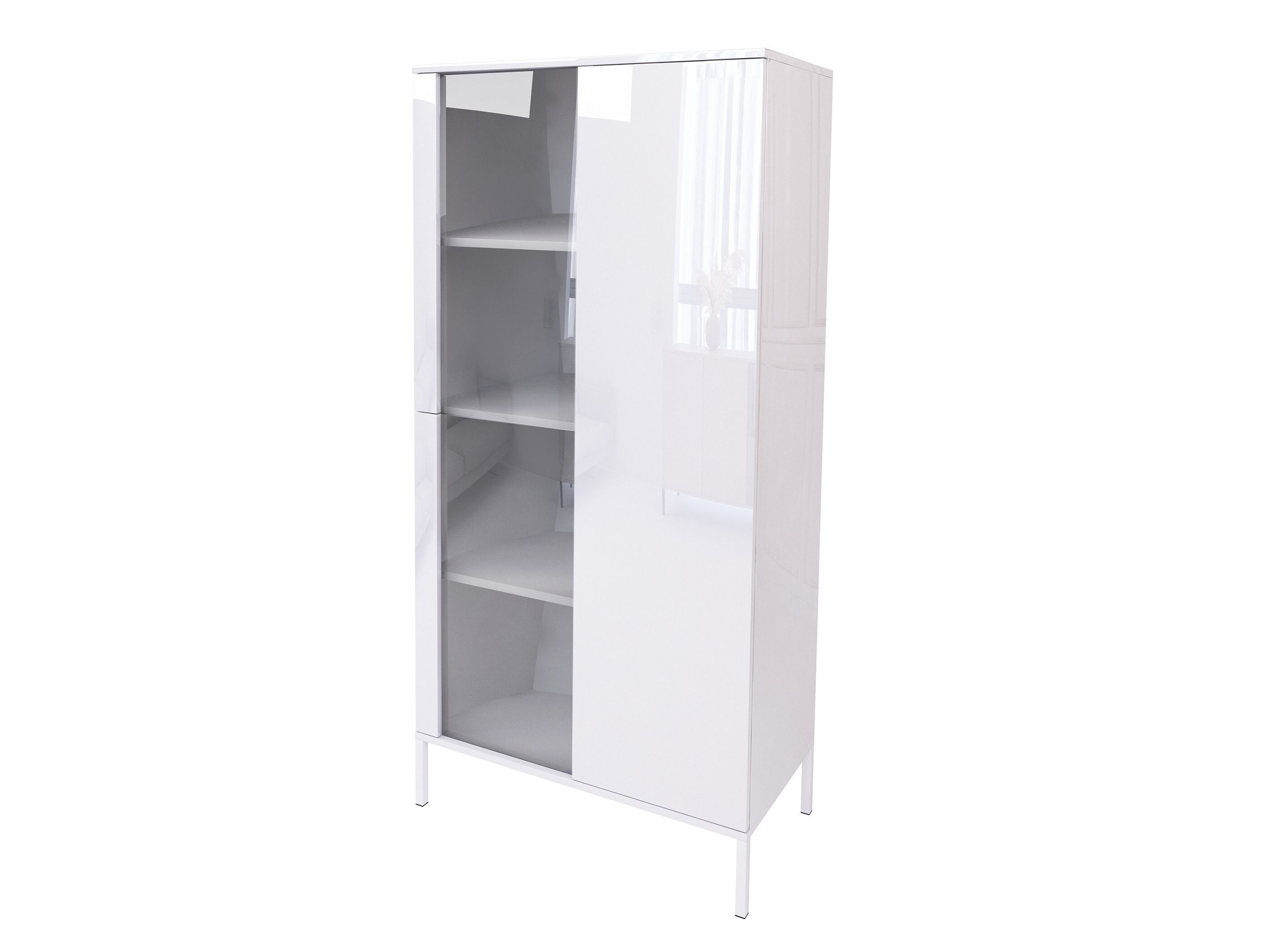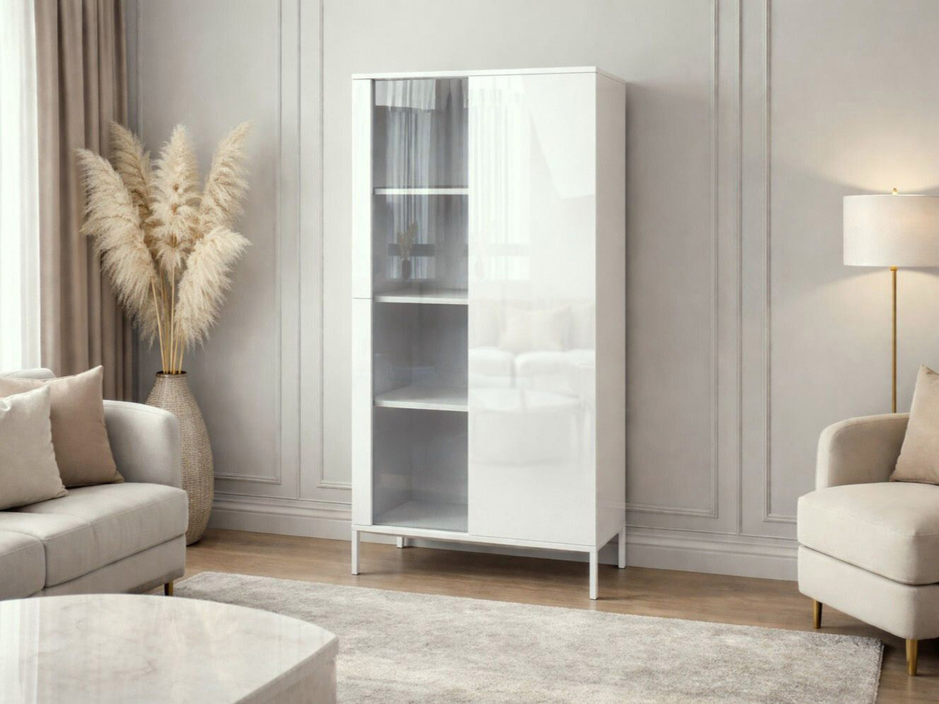 Witryna sprawdzi się jako szafka witryna do salonu na dekoracje i szkło, mebel do jadalni na zastawę lub praktyczna witryna do gabinetu na dokumenty. Dzięki białemu połyskowi pasuje do aranżacji nowoczesnych, minimalistycznych i skandynawskich.