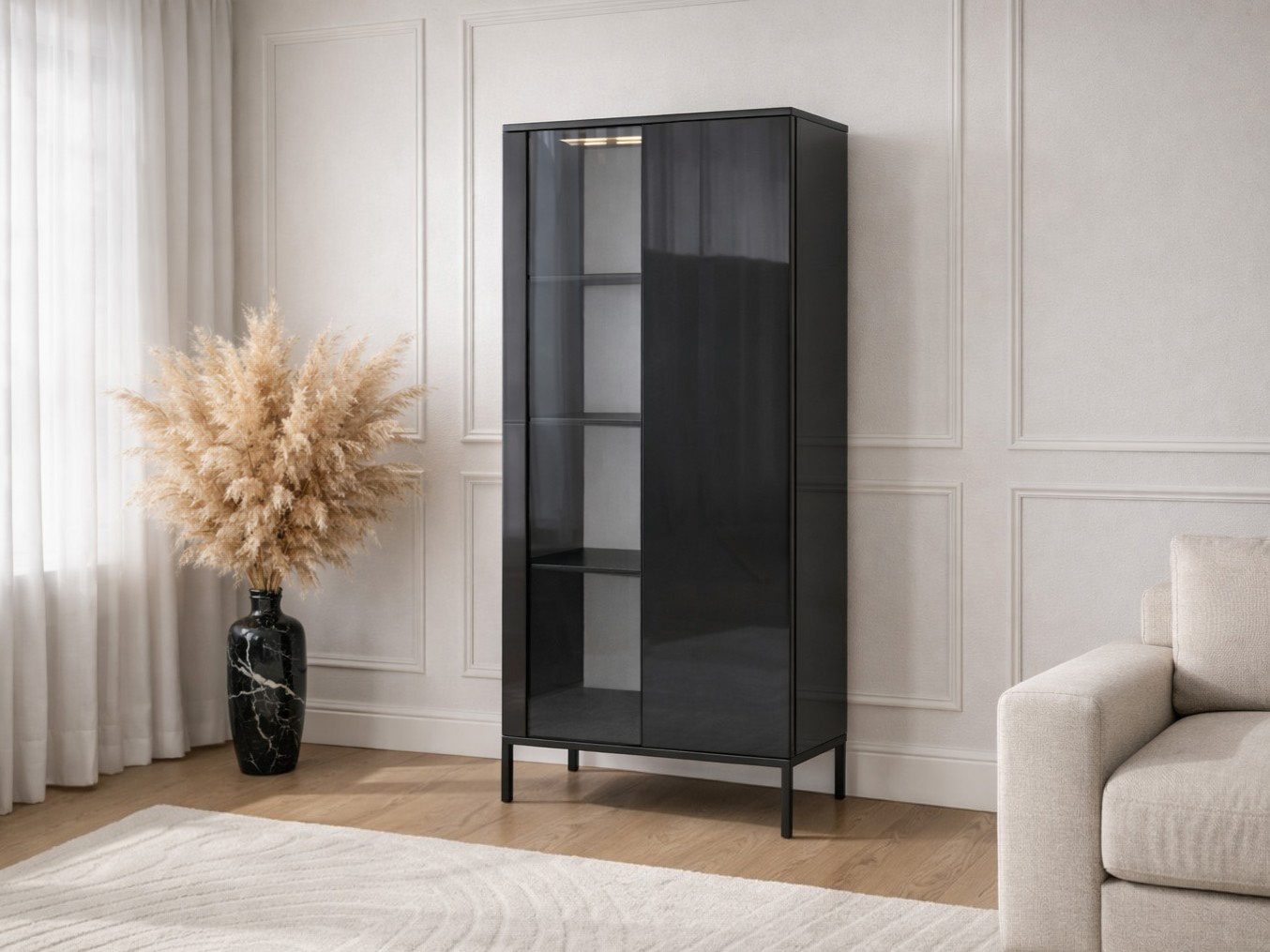Witryna doskonale sprawdzi się jako czarna witryna do salonu na dekoracje, szkło lub książki, elegancka witryna do jadalni oraz nowoczesny mebel do gabinetu. Czerń w wysokim połysku idealnie komponuje się z wnętrzami w stylu nowoczesnym, loftowym i glamour.