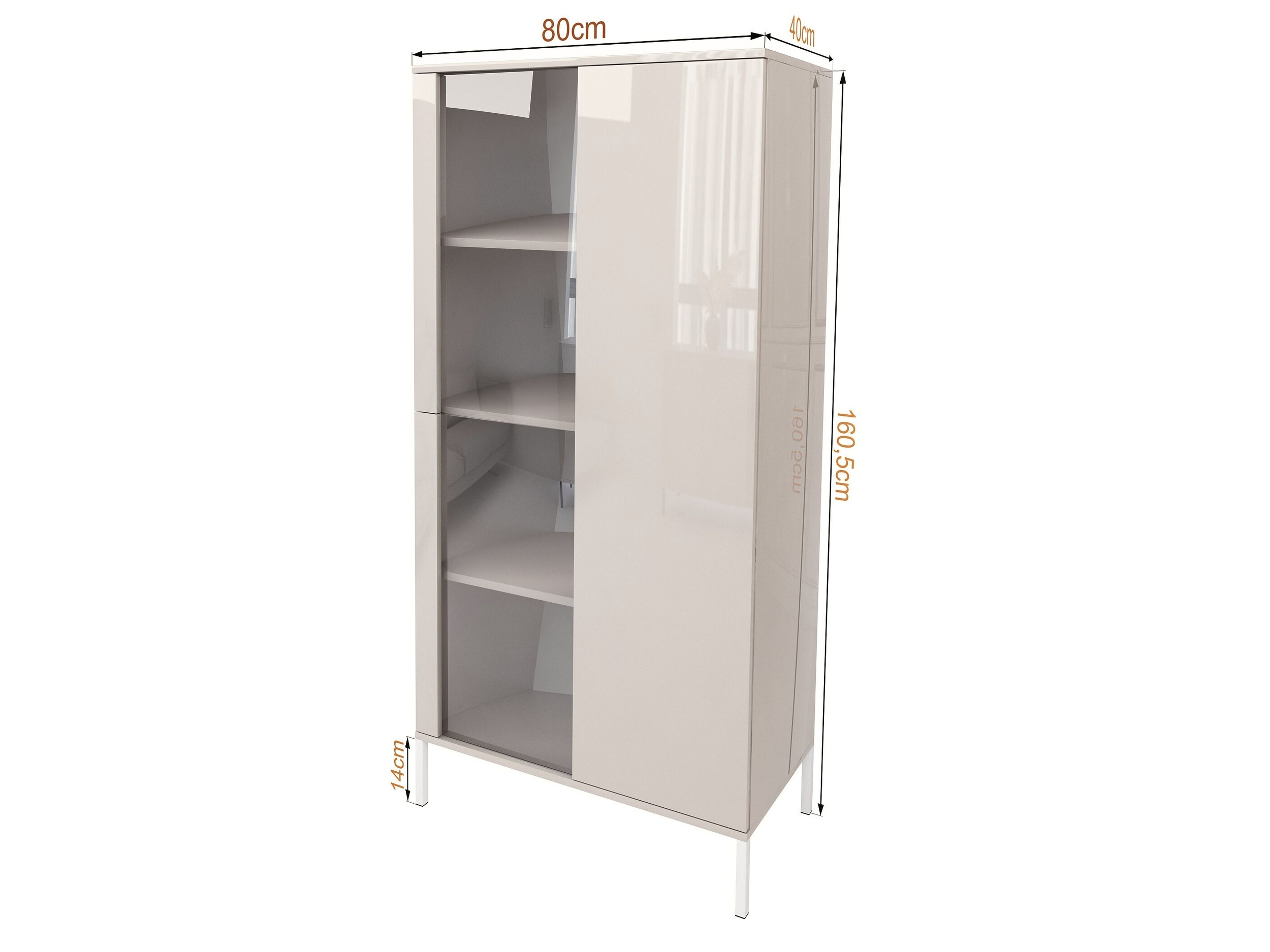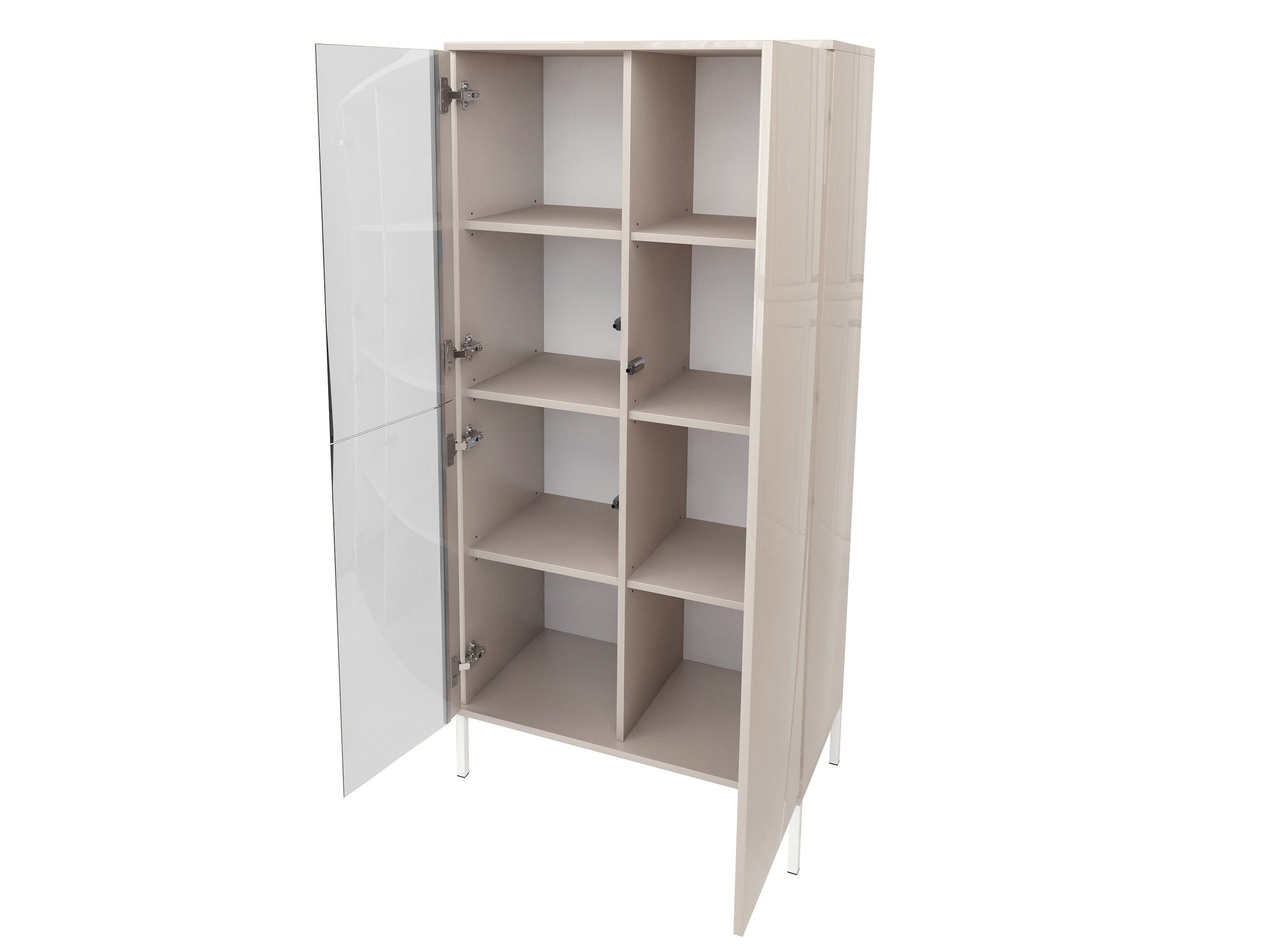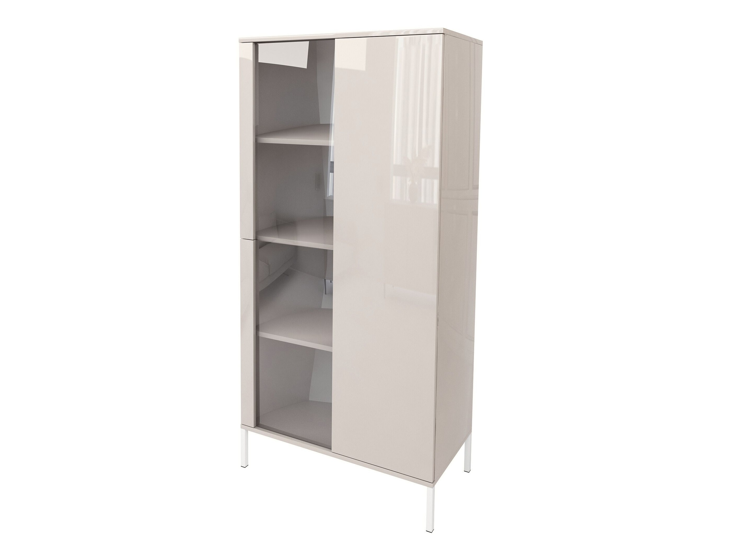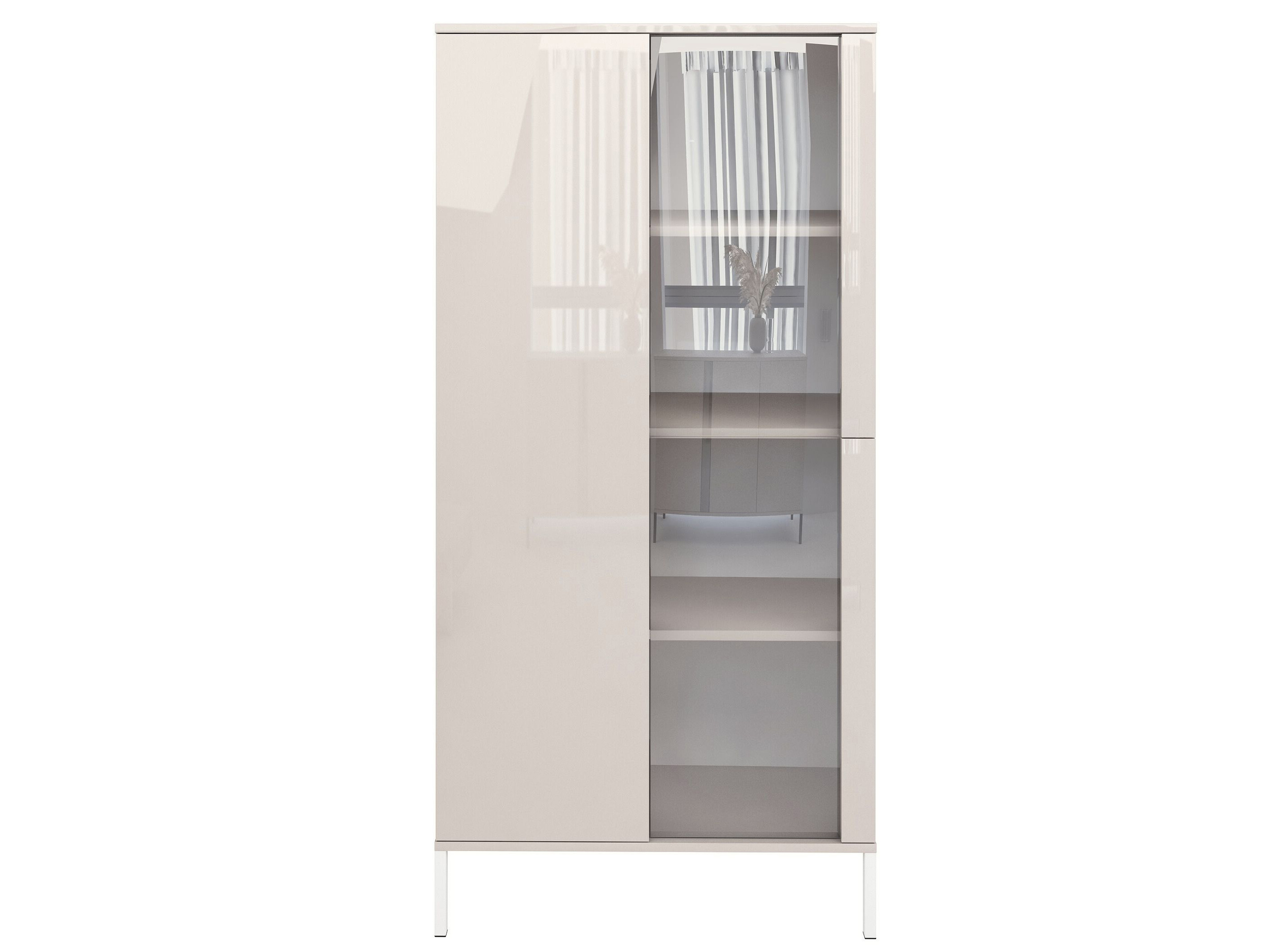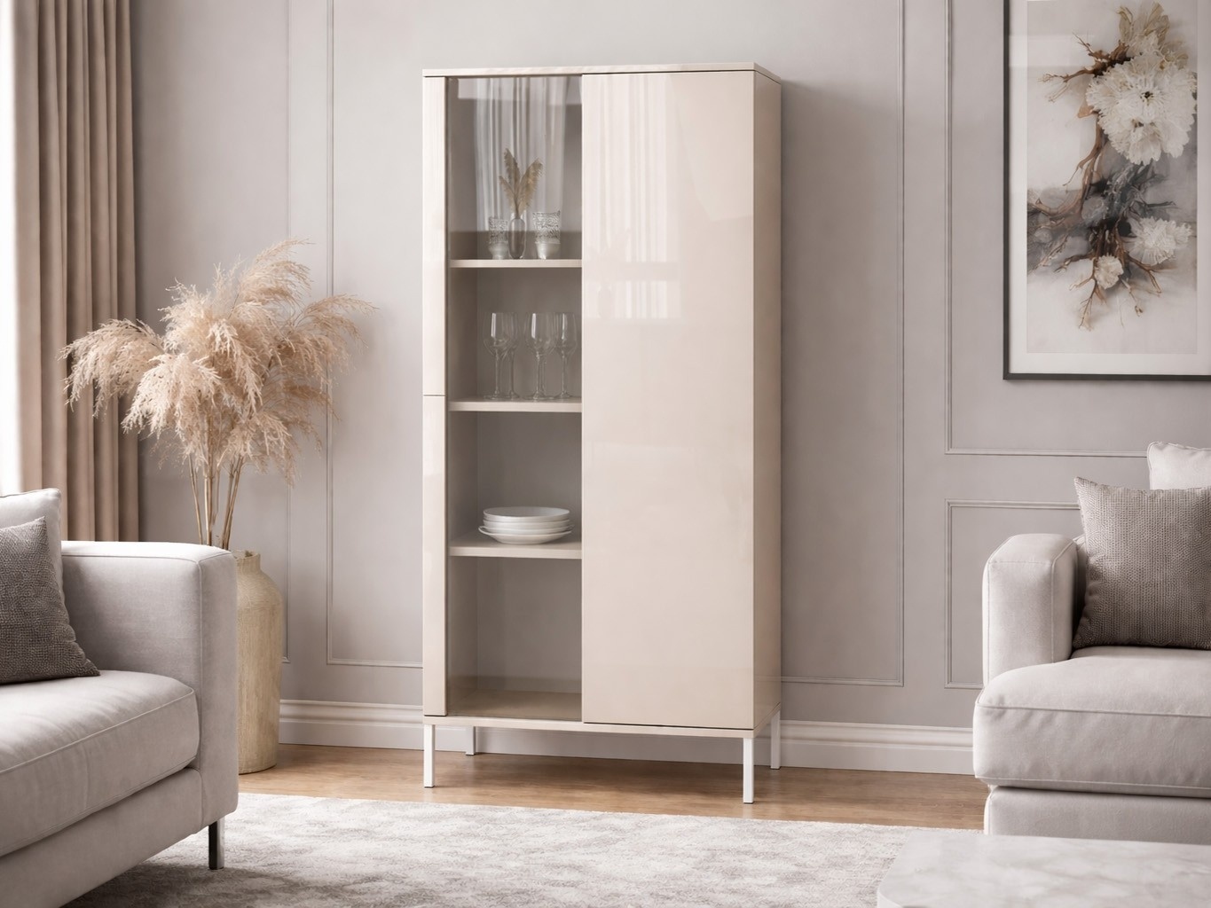 Stylowa witryna w kolorze kaszmiru w wysokim połysku to idealne połączenie nowoczesnego designu, funkcjonalności i ponadczasowej estetyki. Subtelna, jasna kolorystyka w połączeniu z grafitowym szkłem nadaje meblowi luksusowy charakter, który doskonale sprawdzi się zarówno w salonie, jadalni, jak i nowoczesnym gabinecie.